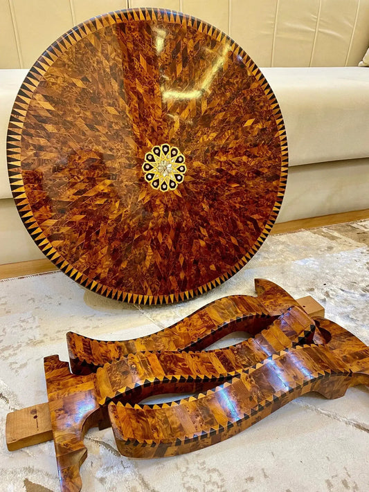 Explore our collection of handcrafted wooden tables, made from natural Thuya burl, cedar, and other Moroccan hardwoods. Each table is shaped, carved, and polished by hand, offering a unique blend of artistry and functionality. These tables are ideal for luxury interiors, boutique hotels, offices, living rooms, and modern homes.