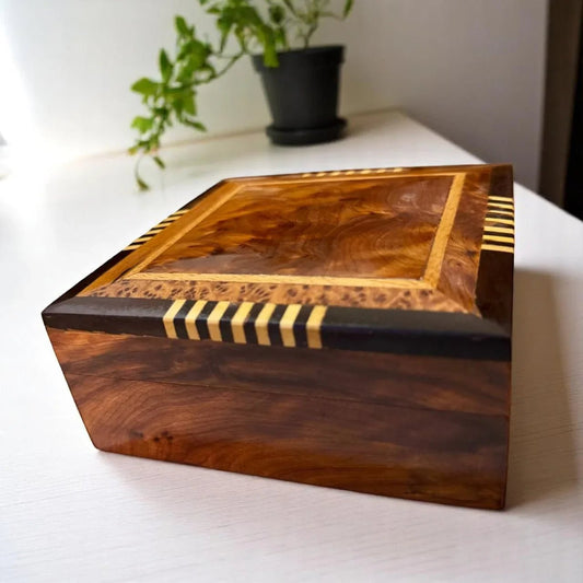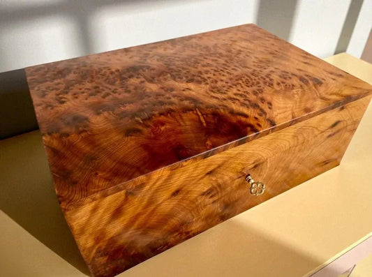 Thuya wood is a rare Moroccan burl known for its deep grain, aromatic scent, and natural shine. Each box is handmade and completely unique.