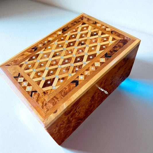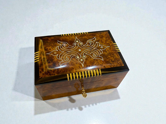 Discover the beauty and craftsmanship of our wooden jewelry box collection—each piece carefully handmade by skilled Moroccan artisans using rare Thuya burl wood found only in the Atlas Mountains. Known for its deep aroma, rich grain patterns, and natural shine, Thuya wood transforms every box into a luxury keepsake that lasts a lifetime.