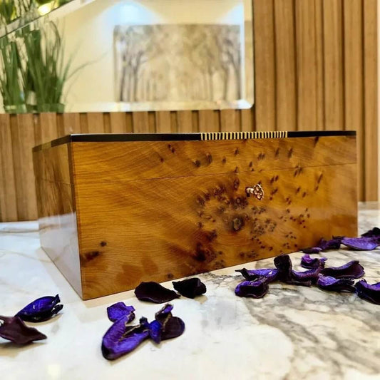 Explore our exclusive collection of handcrafted wooden jewelry boxes, made from authentic Moroccan Thuya burl wood. Each piece features unique grain patterns, a natural cedar-like fragrance, and exceptional craftsmanship passed down through generations.
