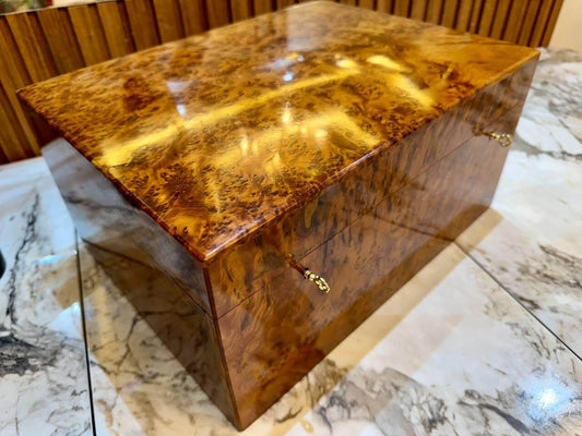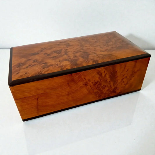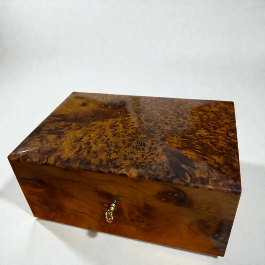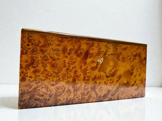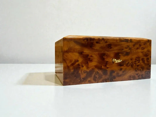 Thuya wood is a rare Moroccan burl known for its deep grain, aromatic scent, and natural shine. Each box is handmade and completely unique.